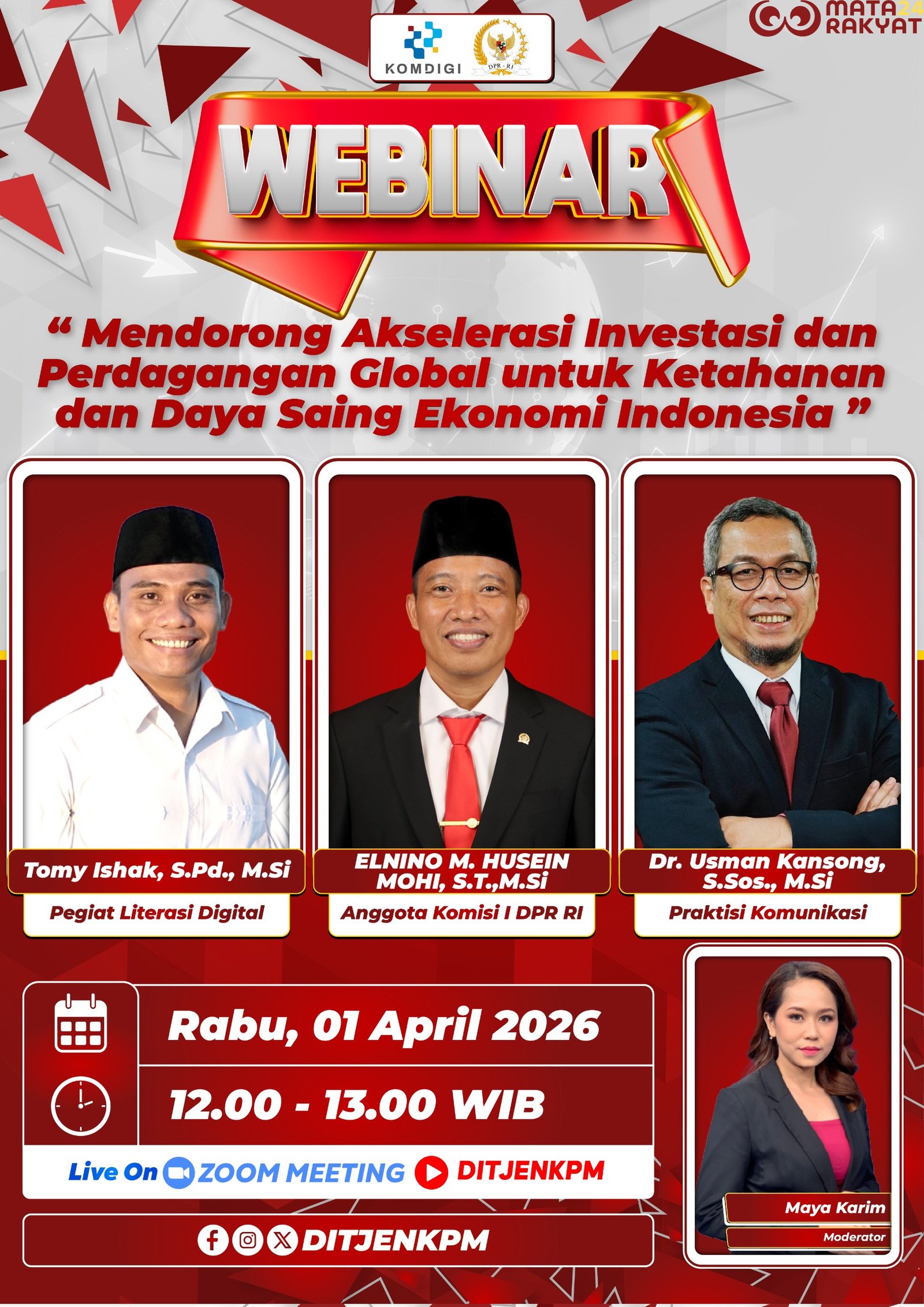 Matarakyat24.com – Transformasi digital dan peningkatan kualitas sumber daya manusia menjadi kunci utama dalam memperkuat daya saing ekonomi Indonesia di tengah perubahan global yang cepat. Hal tersebut mengemuka dalam webinar “Mendorong Akselerasi Investasi dan Perdagangan Global untuk Ketahanan dan Daya Saing Ekonomi Indonesia” yang diselenggarakan pada Rabu (1/4/2025).
