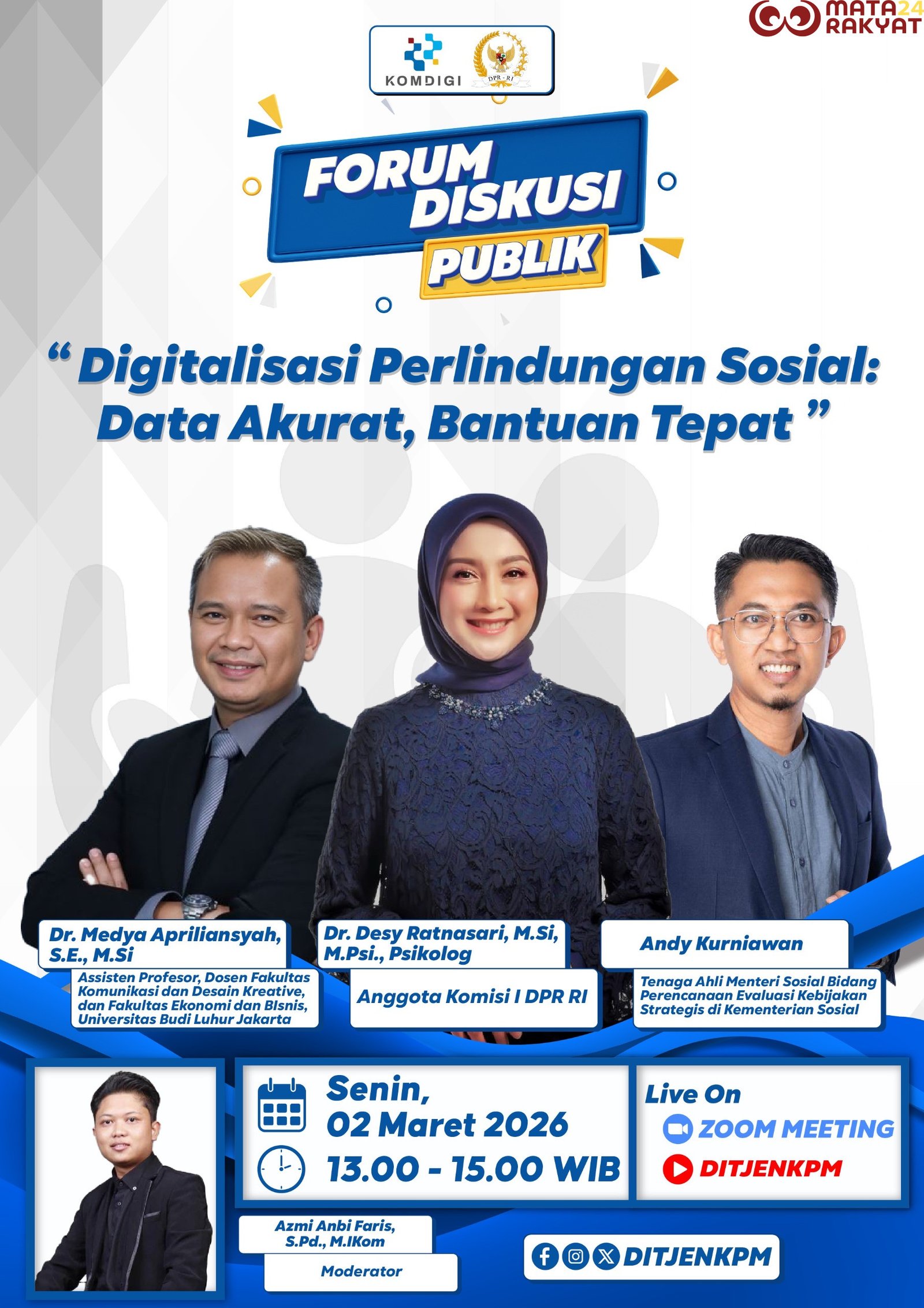 Matarakyat24.com, Jakarta, 2 Maret 2026 — Digitalisasi sistem perlindungan sosial dinilai menjadi langkah strategis dalam memastikan bantuan pemerintah tersalurkan secara tepat sasaran, transparan, dan akuntabel. Hal tersebut mengemuka dalam Forum Diskusi Publikbertema “Digitalisasi Perlindungan Sosial: Data Akurat, Bantuan Tepat” yang diselenggarakan pada Senin (2/3).