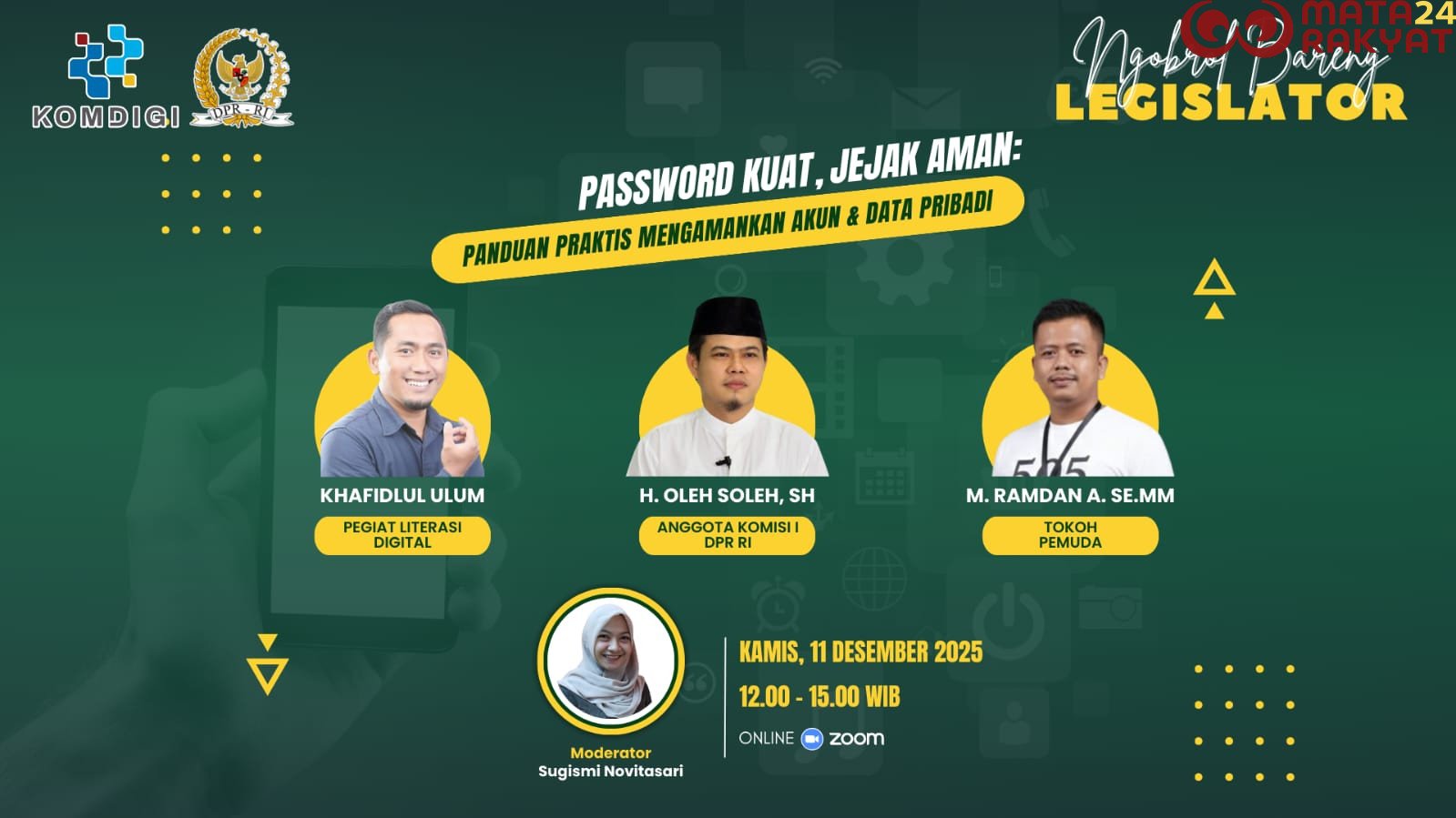 Matarakyat24.com, Jakarta — Ancaman penipuan siber dan kebocoran data pribadi yang kian kompleks menuntut peningkatan kesadaran masyarakat terhadap keamanan digital. Menyikapi hal tersebut, Badan Pengembangan Sumber Daya Manusia Komunikasi dan Digital (BPSDM Komdigi) menyelenggarakan Webinar Ngobras Literasi Digital bertema “Password Kuat, Jejak Aman: Panduan Praktis Mengamankan Akun & Data Pribadi” pada Rabu, 11 Desember 2025.