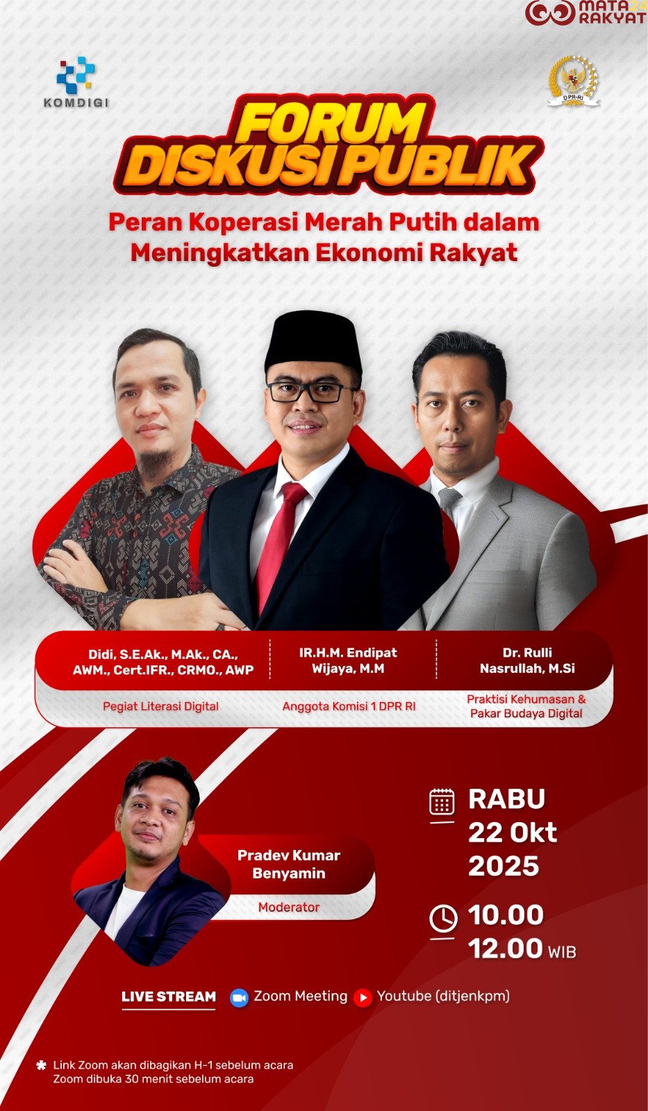 Semangat gotong royong dan kemandirian ekonomi rakyat kembali digaungkan dalam Forum Diskusi Publik bertajuk “Peran Koperasi Merah Putih dalam Meningkatkan Ekonomi Rakyat” yang digelar pada Rabu (22/10). Kegiatan ini menghadirkan sejumlah narasumber lintas bidang, di antaranya Ir. H. M. Endipat Wijaya, M.M. (Anggota Komisi I DPR RI), Dr. Rulli Nasrullah, M.Si. (Praktisi Kehumasan dan Pakar Budaya Digital), serta Didi, S.E.Ak., M.Ak. (Pegiat Literasi Digital).