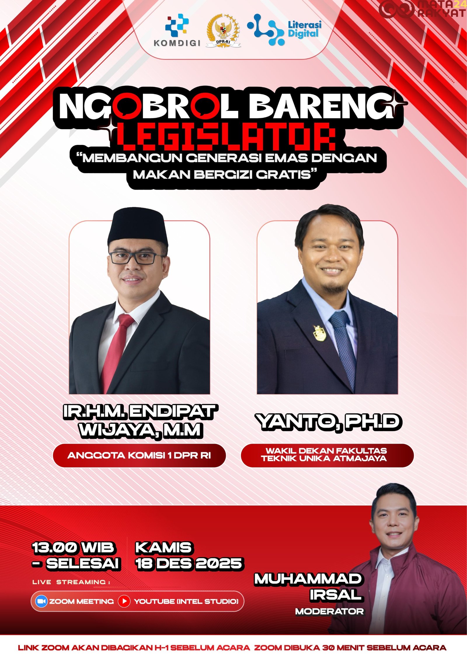 Matarakyat24.com, Jakarta — Upaya membangun kualitas sumber daya manusia sejak usia dini kembali mengemuka dalam kegiatan Ngobrol Bareng Legislator bertajuk “Membangun Generasi Emas dengan Makan Bergizi Gratis” yang digelar pada Kamis, 18 Desember 2025, pukul 13.00 WIB. Kegiatan ini menjadi ruang diskusi strategis yang menegaskan bahwa pemenuhan gizi anak bukan sekadar isu kesehatan, melainkan fondasi masa depan bangsa.