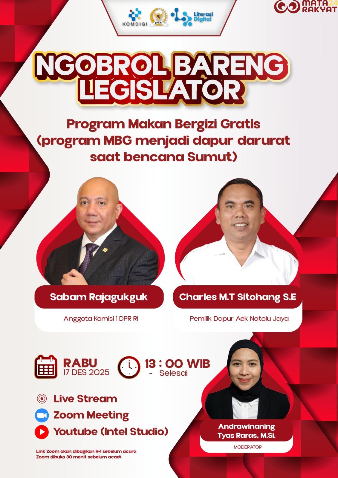 Matarakyat24.com, Jakarta — Program Makan Bergizi Gratis (MBG) dinilai memiliki peran strategis dalam penanganan bencana, khususnya sebagai dapur darurat bagi masyarakat terdampak banjir bandang dan longsor di Sumatra Utara dan Sumatra Barat. Penilaian tersebut mengemuka dalam kegiatan Ngobrol Bareng Legislator bertema “Program Makan Bergizi Gratis (MBG) Menjadi Dapur Darurat Saat Bencana Sumut” yang digelar secara daring, Rabu (17/12/2025).