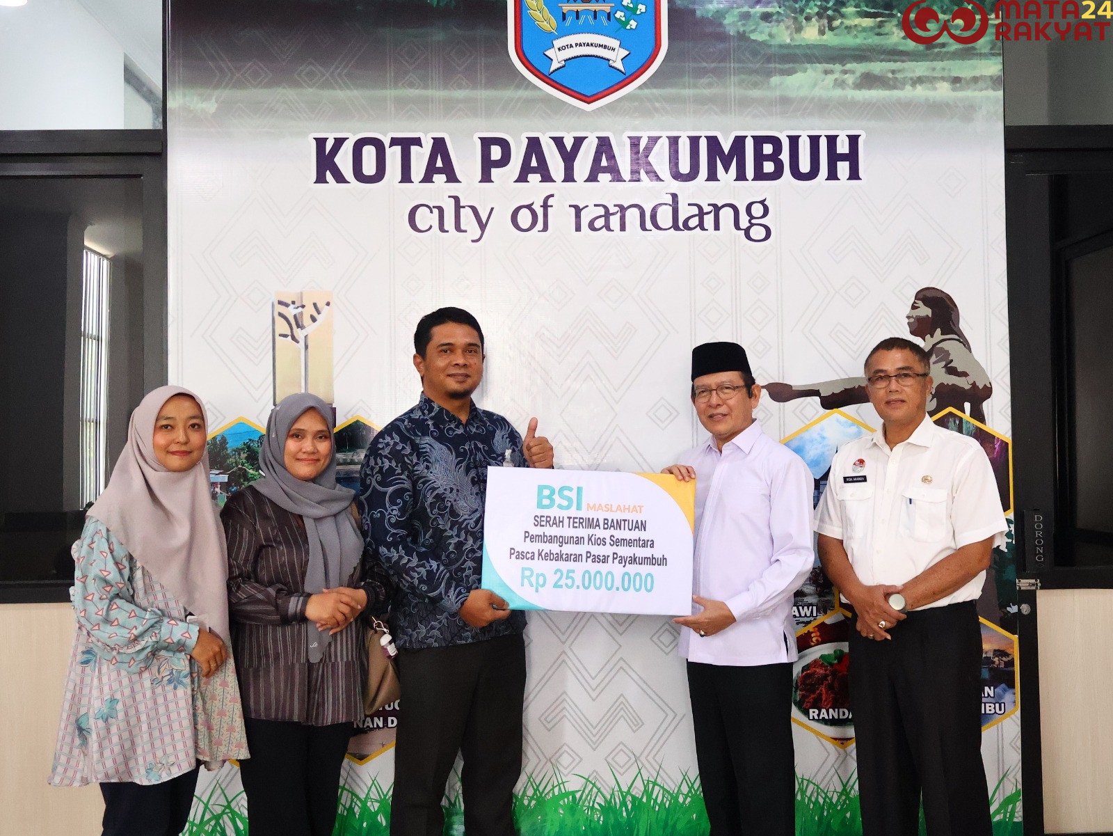 Matarakyat24.com, Payakumbuh — Pemerintah Kota Payakumbuh menerima bantuan kemanusiaan senilai Rp25 juta dari PT Bank Syariah Indonesia Tbk (BSI) untuk mendukung pemulihan Pasar Payakumbuh pascakebakaran.