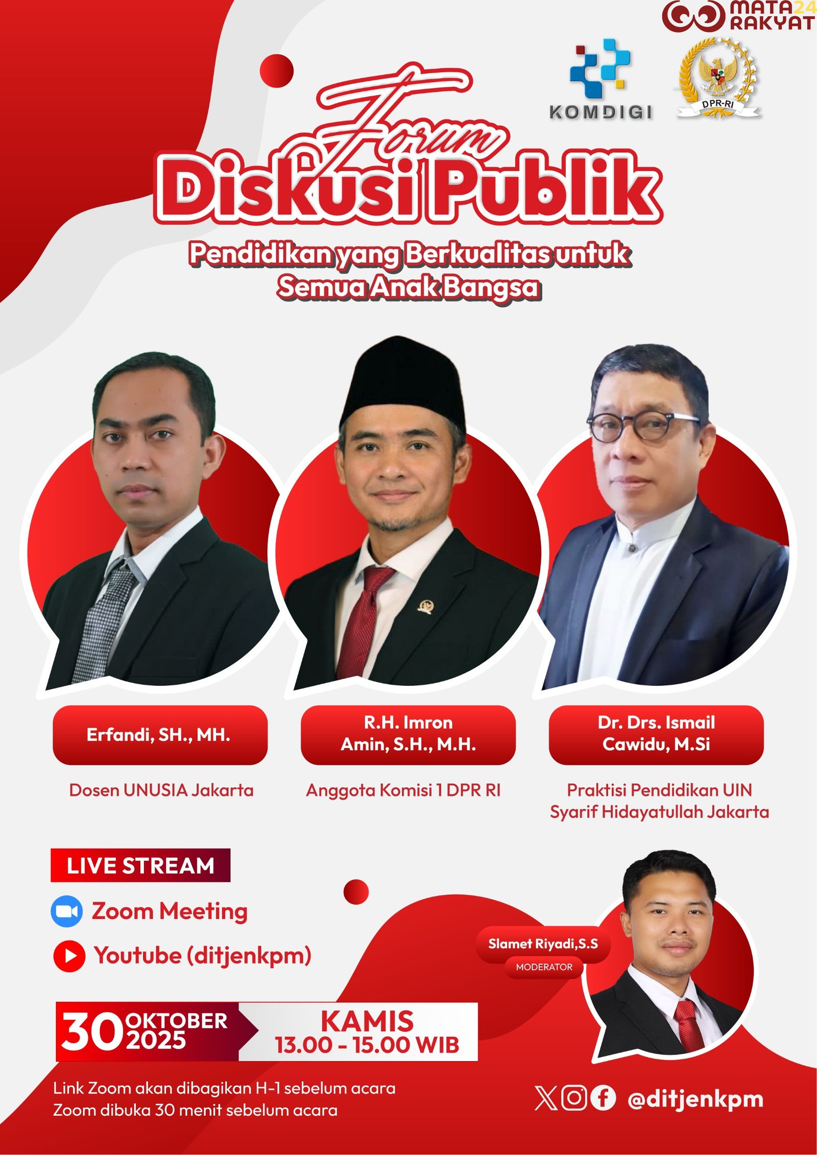 Jakarta, 30 Oktober 2025 — Forum Diskusi Publik bertema “Pendidikan yang Berkualitas untuk Semua Anak Bangsa” menyoroti pentingnya pemerataan akses dan kualitas pendidikan di Indonesia. Acara ini menghadirkan tiga narasumber, yaitu R.H. Imron Gun Gun, S.H., M.H. (Anggota Komisi I DPR RI), Dr. Drs. Ismail Cawidu, M.Si. (Praktisi Pendidikan UIN Syarif Hidayatullah Jakarta), dan Erfandi, S.H., M.H. (Dosen UNUSIA Jakarta).