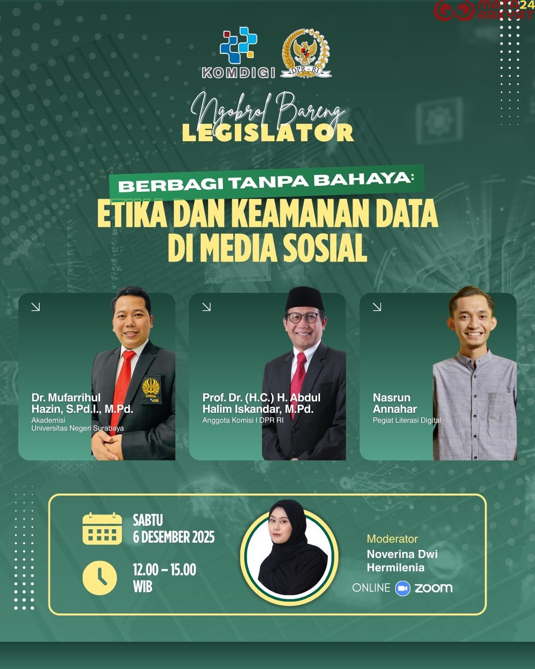 Badan Pengembangan Sumber Daya Manusia Komunikasi dan Digital bersama Anggota Komisi I DPR RI Prof. Dr. (H.C.) Drs. H. Abdul Halim Iskandar, M.Pd. menggelar webinar Ngobras Literasi Digital bertema “Berbagi Tanpa Bahaya: Etika dan Keamanan Data di Media Sosial” di Intel Studio Pasar Minggu, Jakarta Selatan, Sabtu (6/12). Kegiatan ini menyoroti urgensi membangun budaya digital yang aman, santun, dan bertanggung jawab di tengah meningkatnya ancaman cyber di Indonesia.