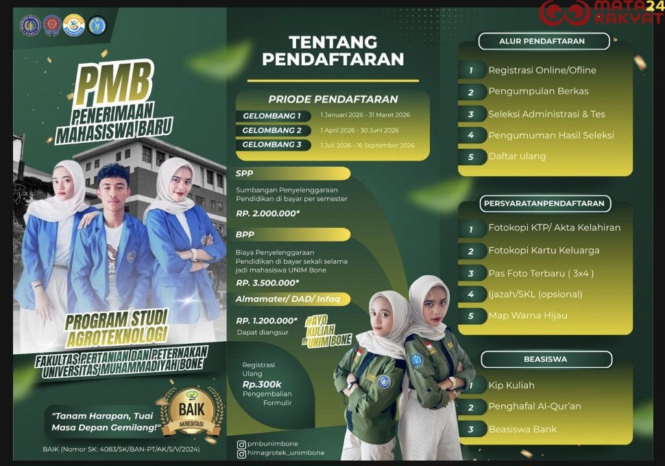 Bone,Matarakyat24.com___ Program Studi Agroteknologi Fakultas Pertanian dan Peternakan Universitas Muhammadiyah Bone kembali membuka Penerimaan Mahasiswa Baru (PMB) Tahun Akademik 2026. Momentum ini menjadi kesempatan emas bagi generasi muda yang ingin berkontribusi dalam pembangunan pertanian yang maju, mandiri, dan berdaya saing.