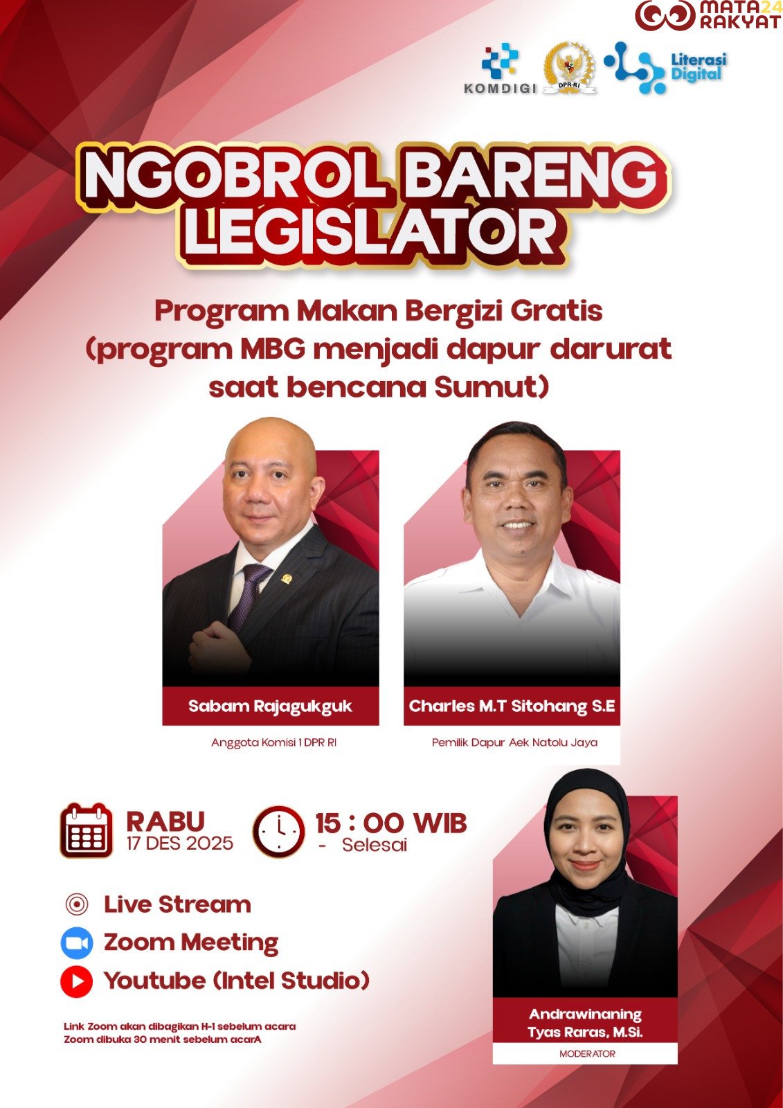 Matarakyat24.com, Jakarta — Program Makan Bergizi Gratis (MBG) dinilai memiliki peran strategis dalam penanganan bencana, khususnya sebagai dapur darurat bagi masyarakat terdampak banjir bandang dan longsor di Aceh, Sumatera Utara, dan Sumatera Barat. Hal ini mengemuka dalam kegiatan Ngobrol Bareng Legislator bertema “Program Makan Bergizi Gratis (MBG) Menjadi Dapur Darurat Saat Bencana Sumut)” yang digelar secara daring pada Rabu (17/12/2025).