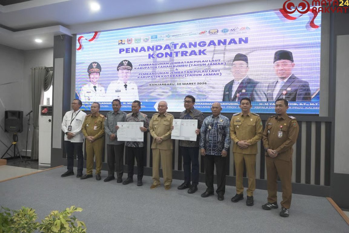 Penandatanganan kontrak proyek dilaksanakan pada Senin, 30 Maret 2026, bertempat di Aula Kantor Dinas Pekerjaan Umum dan Penataan Ruang Provinsi Kalimantan Selatan, Banjarbaru. Penandatanganan dilakukan oleh Kepala Dinas PUPR Kalimantan Selatan, M. Yasin Toyib, bersama pihak penyedia jasa, serta disaksikan oleh Gubernur Kalimantan Selatan H. Muhidin, Ketua DPRD Kalimantan Selatan H. Supian HK, Sekretaris Daerah Provinsi Kalimantan Selatan, Bupati Tanah Bumbu dan Bupati Kotabaru, serta Direktur Operasi Bidang Infrastruktur PTPP, Yul Ari Pramuraharjo.
