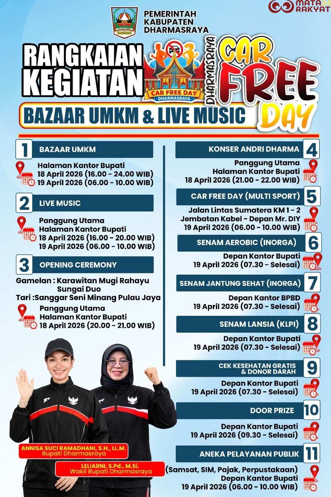 Matarakyat24, Dharmasraya – Pemerintah Kabupaten Dharmasraya akan menggelar rangkaian kegiatan Car Free Day (CFD) yang dipadukan dengan bazaar UMKM, hiburan, olahraga, pada 18–19 April 2026 di kawasan Kantor Bupati dan sekitarnya.