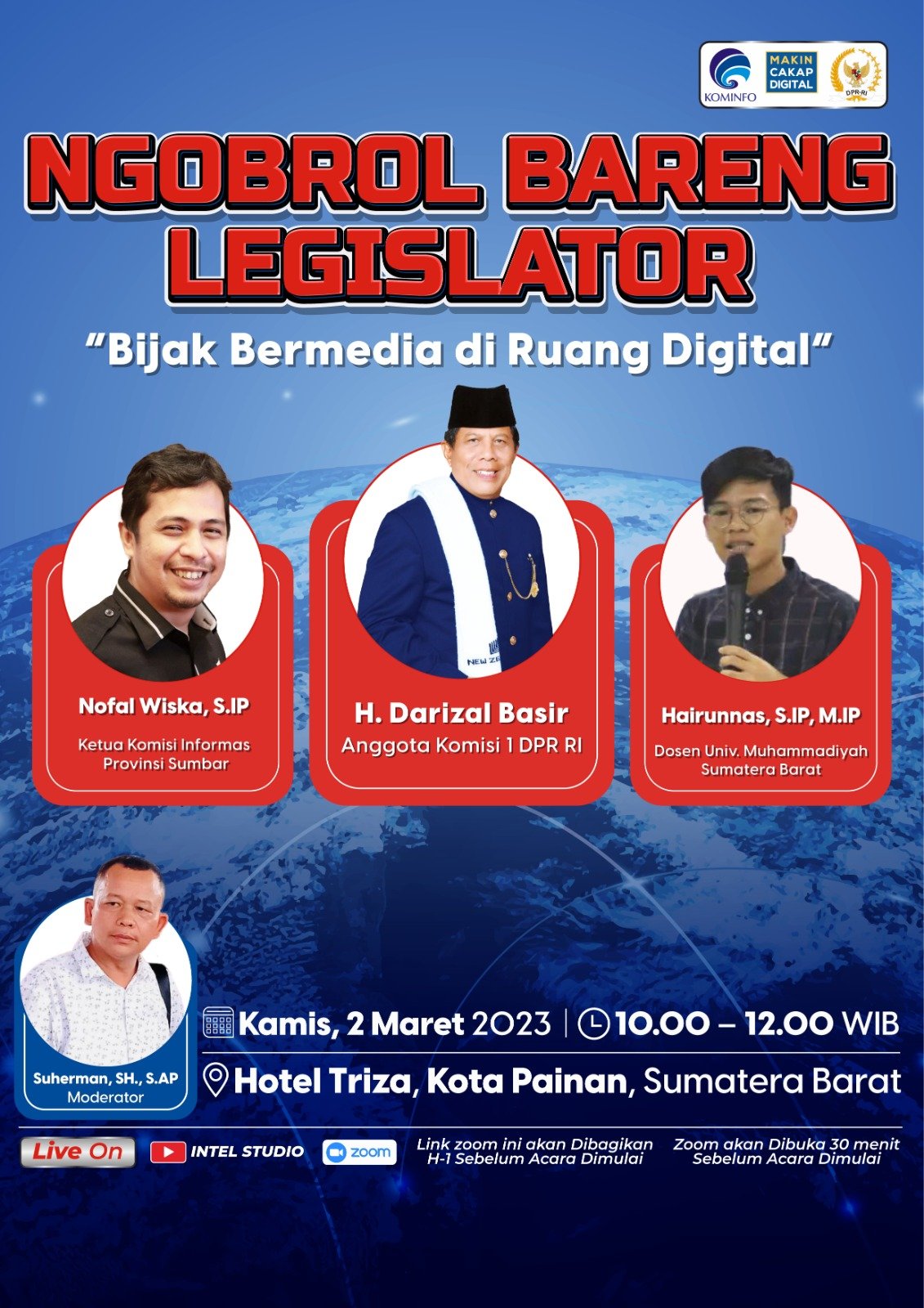 Matarakyat24.com, Painan – Kamis ( 02/03/2023 ) pagi pukul 10.00 s/d 12.00 WIB Kemenkominfo dan DPR RI Komisi I Darizal Basir mengadakan webinar dengan tema ” Bijak Bermedia Sosial ” .