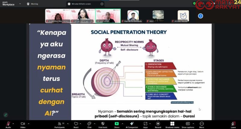 Acara yang diselenggarakan secara daring ini menghadirkan Mirratul Afifah M.Psi., Psikolog (Psikolog Klinis Rumah Pulih) dan Muhammad Andhika Prasetya (Founder Temani) sebagai narasumber, dengan Dinda Maharani dari IndigoHub Bandung sebagai moderator. Para pembicara memaparkan pandangan mereka terkait bagaimana AI dapat digunakan secara positif di ranah personal, sambil tetap memperhatikan batas etis dan kesehatan mental pengguna.