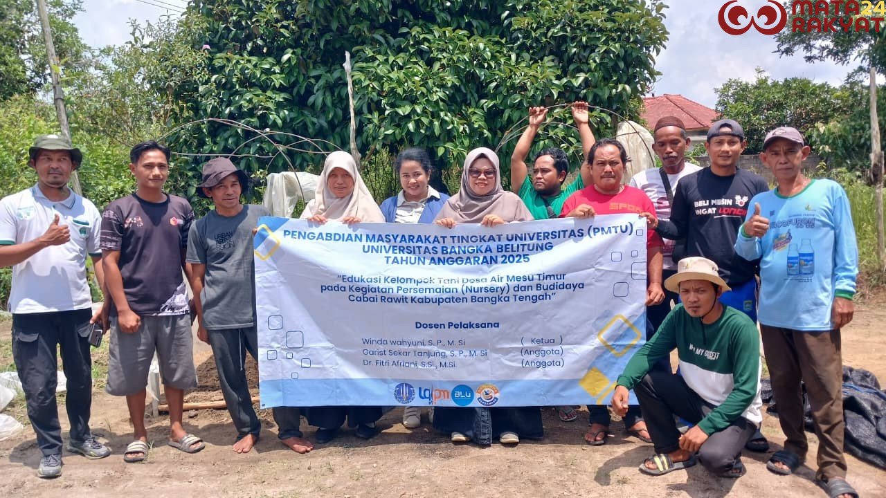 Matarakyat24.com — Bangka Tengah – Akademisi Universitas Bangka Belitung (UBB) melaksanakan kegiatan pengabdian masyarakat di Desa Air Mesu Timur, Kecamatan Pangkalan Baru, Kabupaten Bangka Tengah. Kegiatan ini difokuskan pada pemberdayaan petani melalui Edukasi Kelompok Tani pada Kegiatan Persemaian (Nursery) dan Budidaya Cabai Rawit. Dalam pelaksanaannya, tim pengabdian (Winda Wahyuni, Garist Sekar Tanjung dan Dr. Fitri Afriani) menyalurkan bantuan berupa rak persemaian dan saprodi persemaian untuk kegiatan budidaya cabai rawit kepada Kelompok Tani Makmur yang mewakili masyarakat Desa Air Mesu Timur. Bantuan tersebut diberikan sebagai bentuk dukungan nyata terhadap peningkatan kapasitas petani dalam mengembangkan komoditas cabai rawit unggulan.