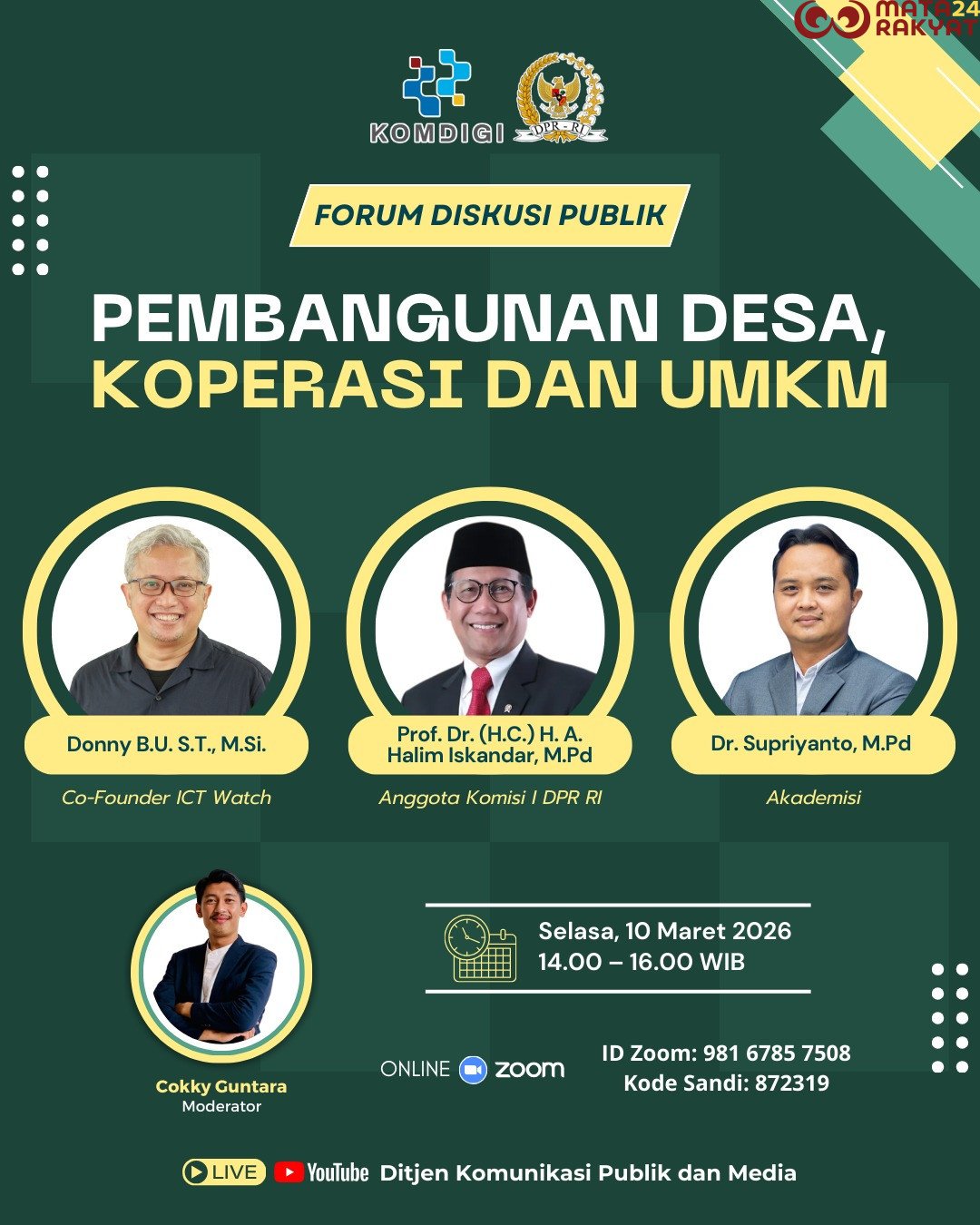 Matarakyat24.com — Upaya memperkuat pembangunan ekonomi masyarakat desa menjadi sorotan utama dalam webinar bertema “Pembangunan Desa, Koperasi dan UMKM” yang digelar pada Selasa, 10 Maret 2026 pukul 14.00–16.00 WIB di Intel Studio Pasar Minggu, Kompleks TNI AL, Jakarta Selatan.
